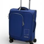 This product is the Calvin Klein Scuba Range Softside Luggage in Blue. It is a lightweight, durable suitcase designed with high-density polyester and a distinct textured finish.