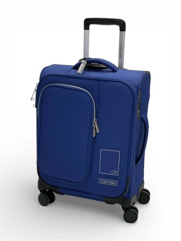 This product is the Calvin Klein Scuba Range Softside Luggage in Blue. It is a lightweight, durable suitcase designed with high-density polyester and a distinct textured finish.
