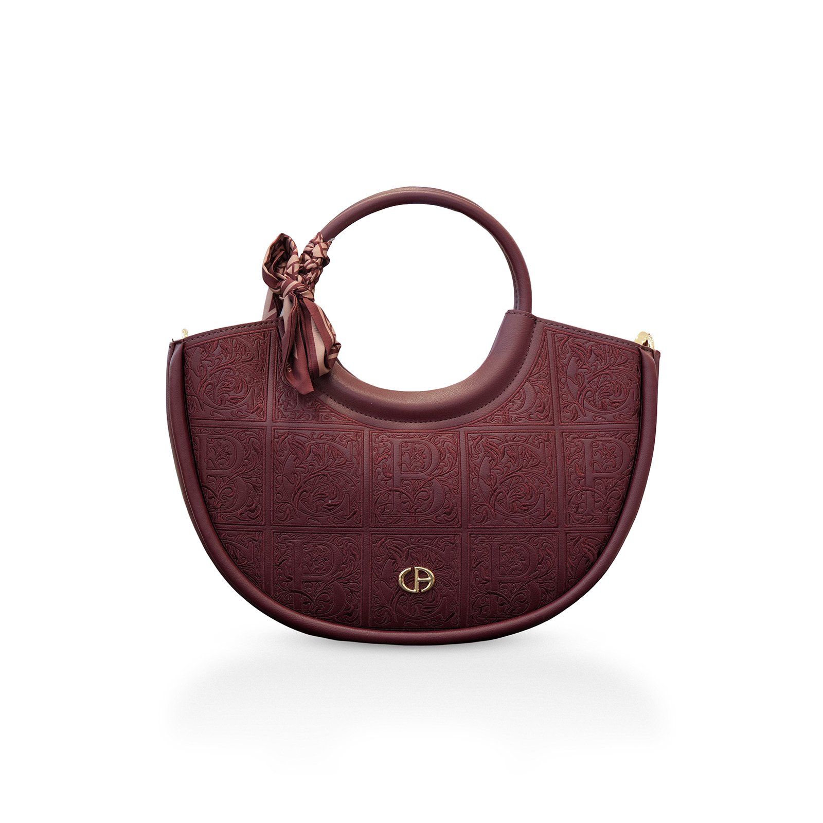 A stylish top-handle and shoulder bag from the Chrisbella brand in a deep maroon hue, featuring a unique all-over embossed pattern, a curved shape, and a decorative scarf tied to the circular top handle. It includes an optional shoulder strap for versatile carrying.