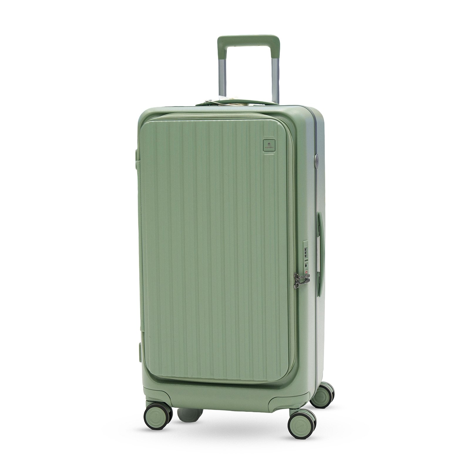 A highly functional carry-on suitcase from the CROWN Boxy collection, featuring an innovative vertical front opening, a durable polycarbonate shell in Earth Green, and dual silent spinner wheels. It is designed for easy access to essentials like laptops and a smooth travel experience.