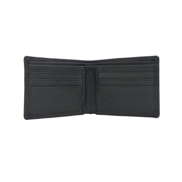 A sleek, traditional black leather bifold wallet designed for daily use, featuring multiple internal card slots and a dedicated cash compartment to keep essentials organized.