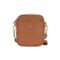 A stylish and compact camera-style crossbody bag from the brand Hippoti, crafted in genuine tan leather with a unique circular brand emblem and gold-tone hardware. This functional bag is perfect for everyday essentials.