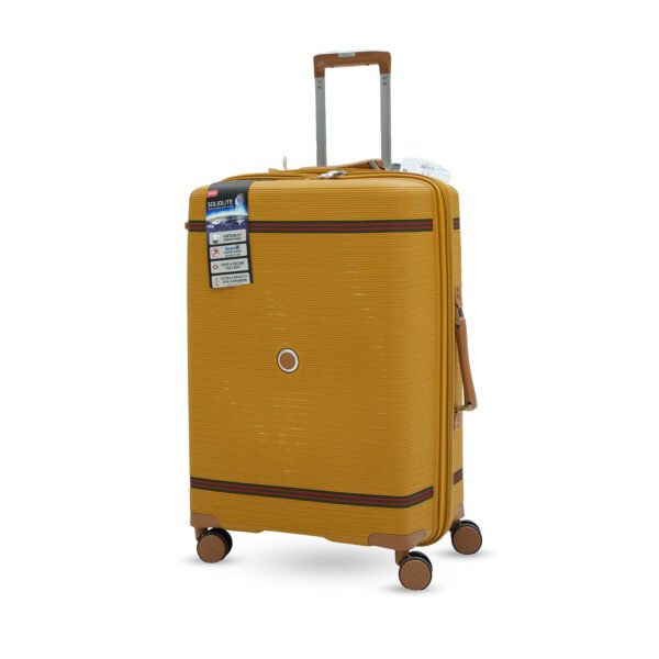 The IT Luggage Solidlite collection is designed for the modern traveler, offering a blend of unmatched durability and lightweight construction. The suitcase features a tough polypropylene (PP) hard outer shell, which provides virtually unbreakable protection for your belongings during transit. The stylish ribbed-effect design is detailed with green & red decorative webbing alongside an almond trim.