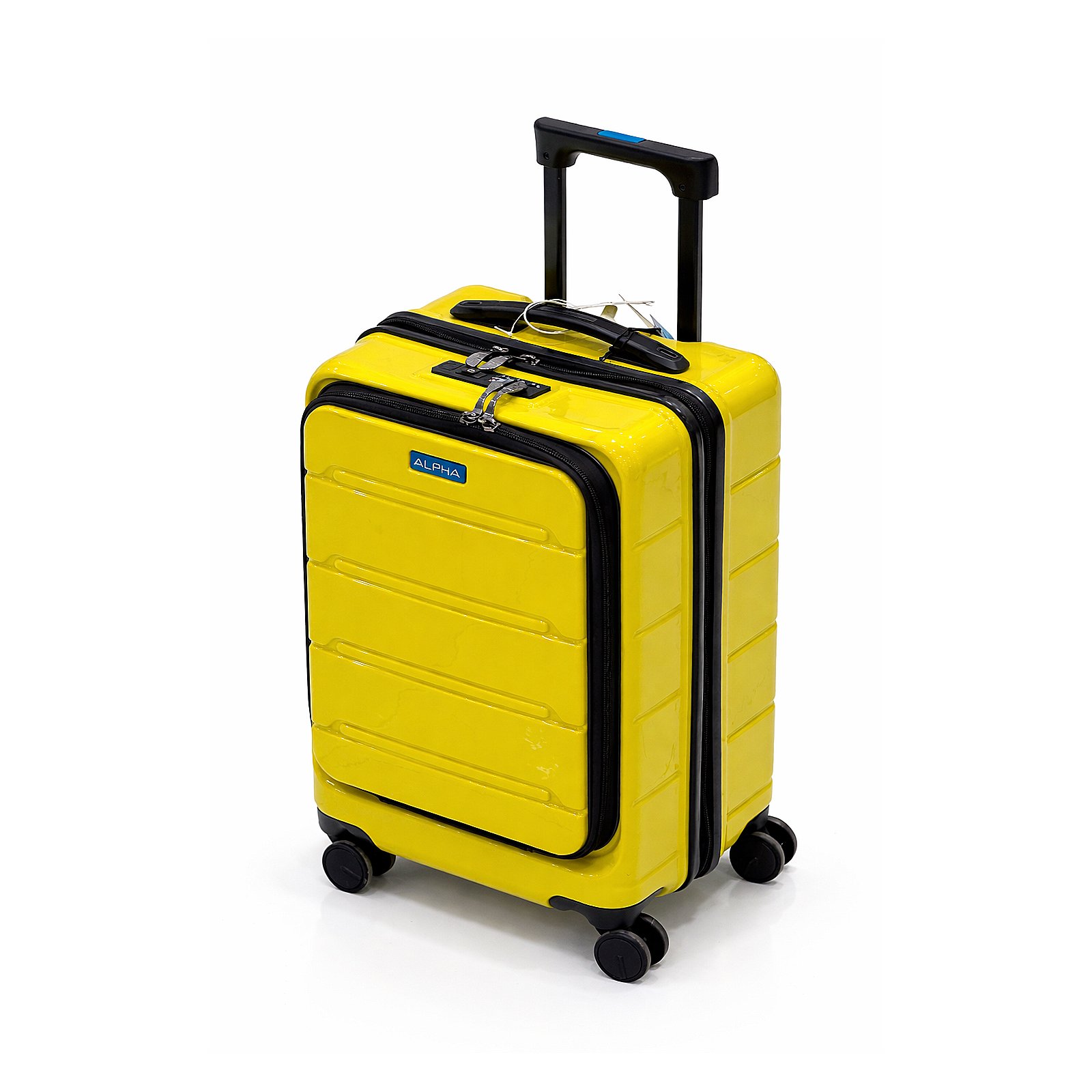 The Lushberry Alpha is a vibrant and durable 19-inch carry-on suitcase, perfect for a short getaway or business trip. It features a lightweight yet strong polycarbonate hardshell with a distinctive line pattern, a convenient top-opening design for easy access, silent 360° spinner wheels, and a built-in USB/Type-C charging port.
