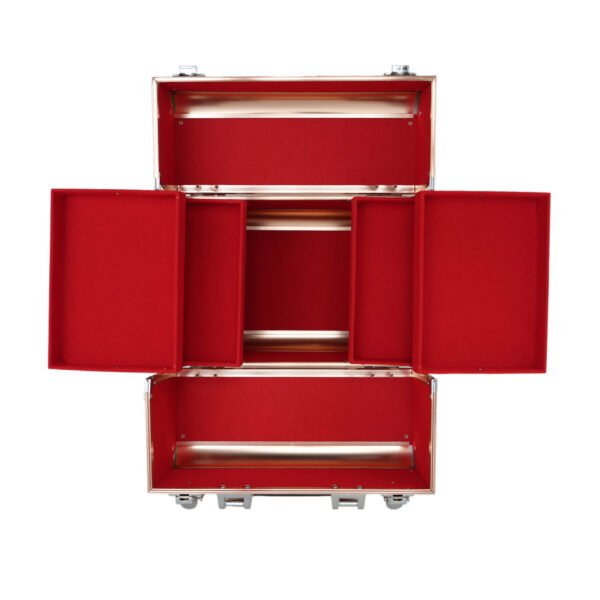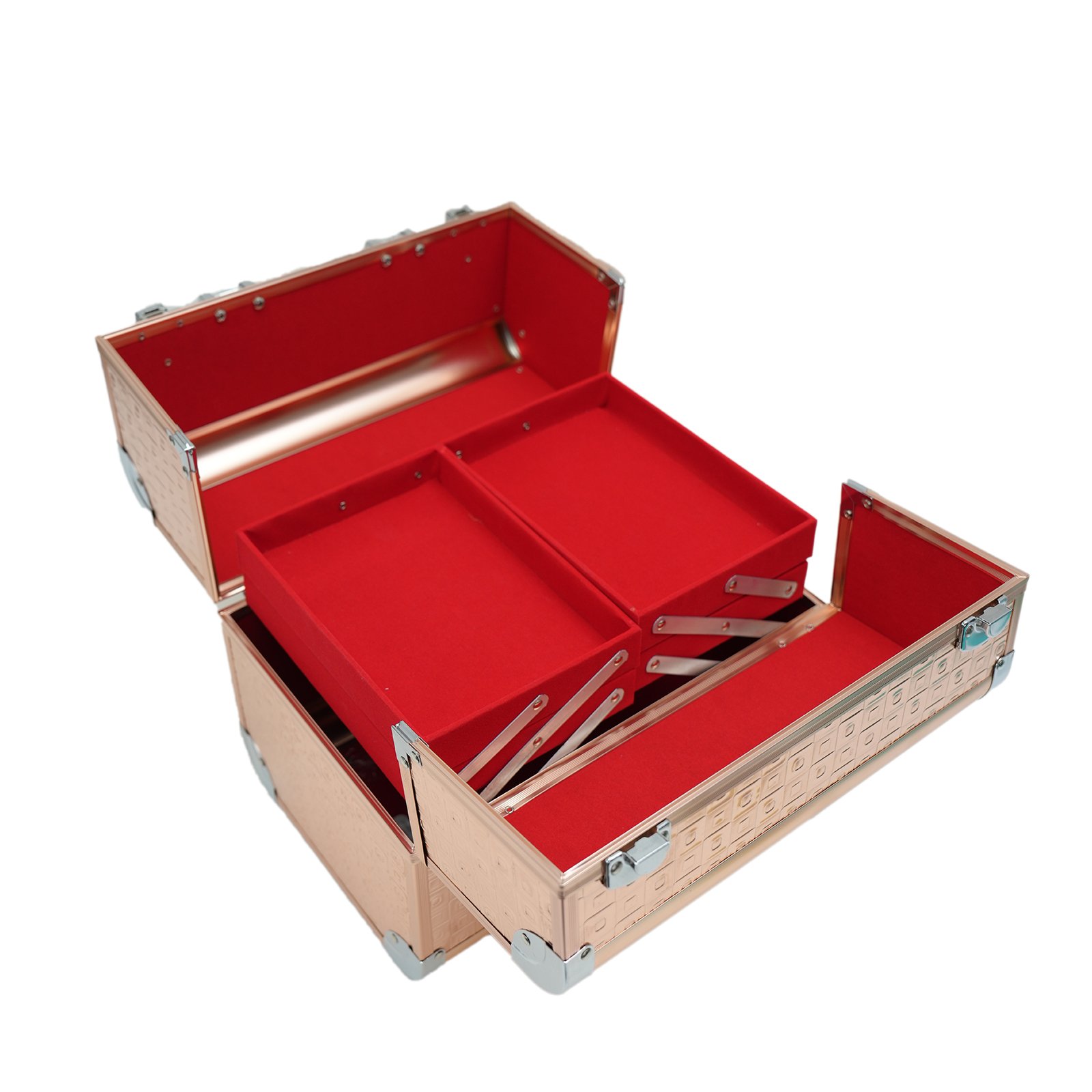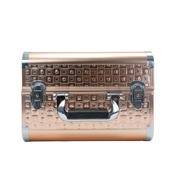 This professional-grade cosmetic case is constructed from lightweight yet durable aluminum and finished in an elegant rose gold color with a distinctive geometric, square-patterned texture. It features secure, chrome-plated lockable latches (keys typically included) and a sturdy, comfortable carrying handle for secure and easy portability. The interior often includes functional organizational features such as multi-tiered, cantilevered trays that pull out automatically when the case is opened, providing ample space and visibility for various beauty products and accessories. The case is designed to keep items organized and secure, whether for a professional makeup artist or for personal travel and storage.Â