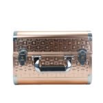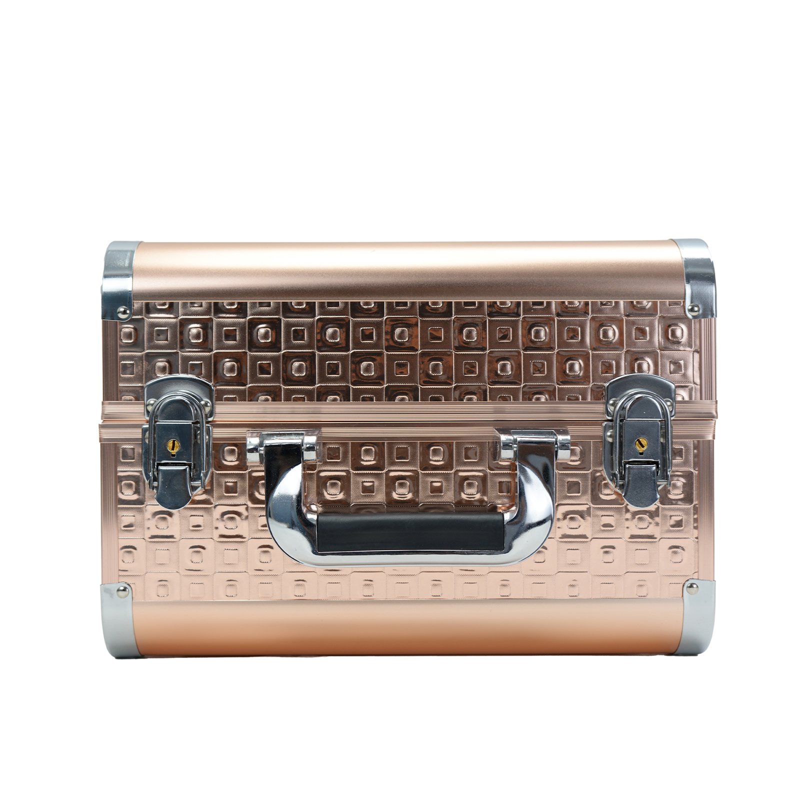 A portable, lockable rose gold aluminum makeup train case featuring a stylish square-patterned texture, chrome trim, handle, and latches. This durable case is ideal for organizing and transporting cosmetics, jewelry, or nail supplies.Â